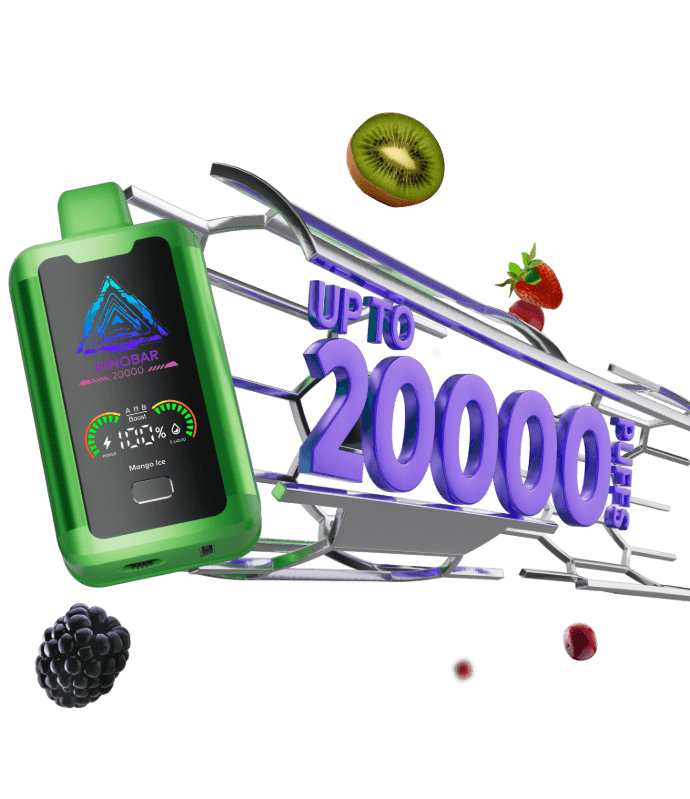Entdecken Sie den Komfort des Innobar 20000 mit einem 650mAh-Akku, Echtzeit-Akku-Anzeige und USB-C-Laden. Passen Sie Ihr Dampferlebnis mit dem unteren Luftstromwähler für Ihren bevorzugten Zug an.